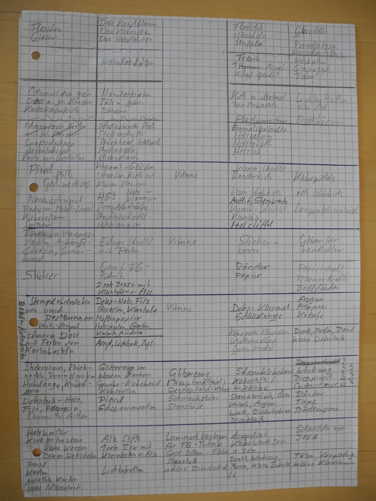 Ich befüllte also die einzelnen Schubladen und Einsätze mit Türen. Damit ich immer schnell Zugriff zum eingeräumten Material habe, machte ich mir ein Inhaltsverzeichnis. Ich wollte es zwar noch mal ins „Reine“ schreiben, aber ich komme einfach nicht dazu. So bleibt mir nichts Anderes übrig, als Euch die ursprüngliche Version zu zeigen.