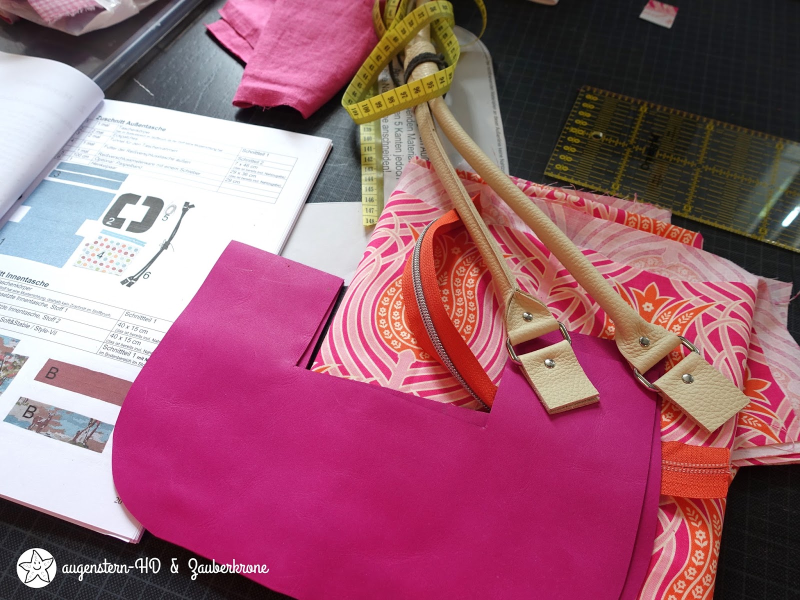 Für die zweite Tasche, die ich am Sonntag zugeschnitten hatte, brachte Frau Machwerk ein megaschönes Fuchsia farbenes Leder mit, dass sie „in einem Anflug von Wahnsinn“ in ihren Vorrat aufnahm. Daraus nähe ich mir gerade die Carpet Bag Handtasche. Sie ist aber noch nicht ganz fertig.