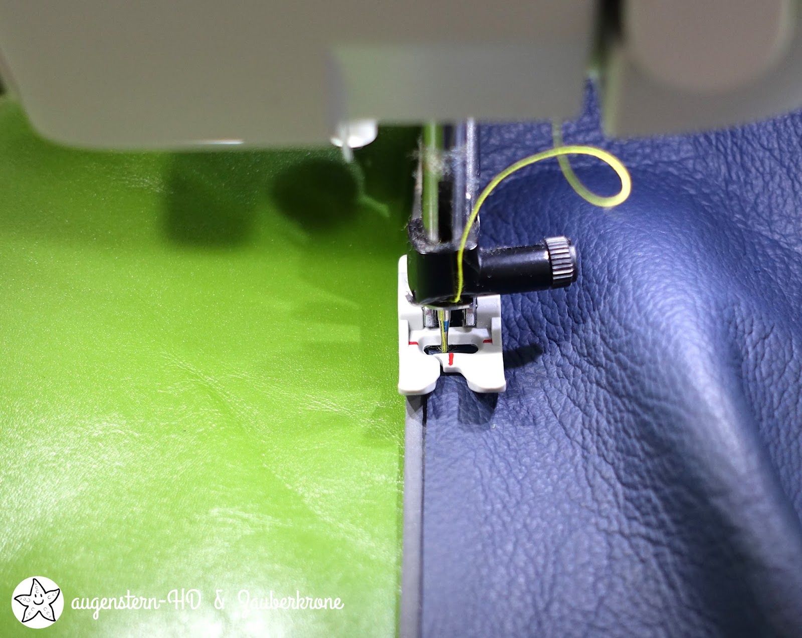 Für mich war es das erste Mal, dass ich Leder vernäht habe. Mit der Jeansnadel und dem Teflonfuß ging es leichter als gedacht von der Hand und um das Leder nicht zu stark zu strapazieren wurde die Sticklänge auf 4.0 eingestellt. Klar, an den ganz dicken Lederstellen habe ich gaaaanz langsam genäht und an manchen stellen nur das Handrad gedreht. Aber es hat gut geklappt. Am Ende des ersten Kurstages wurde ich mit der Ewa fast fertig.
