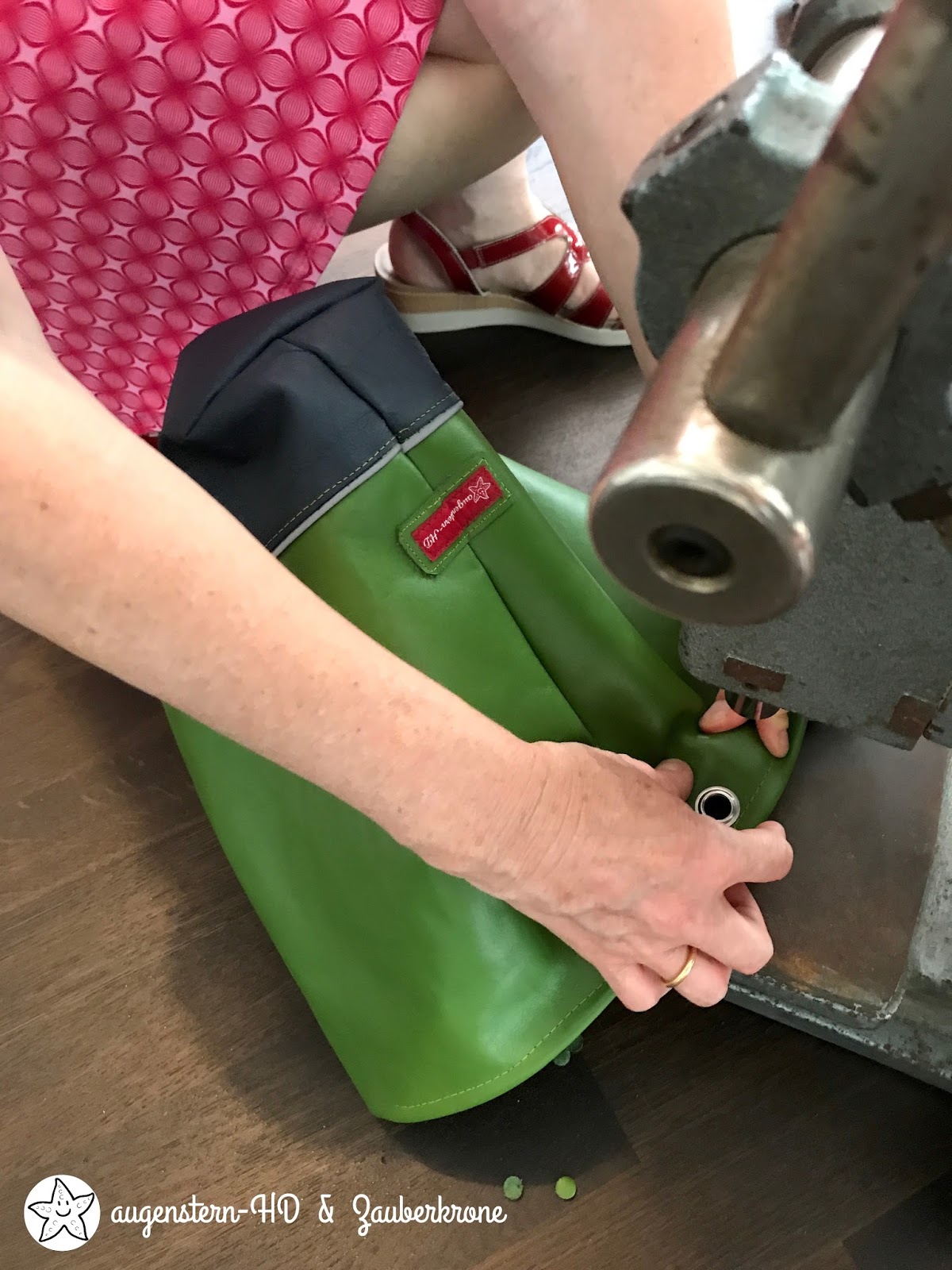 Im Anschluss wurde der oberen Rand nach innen geklappt und mit einer Naht fixiert. Dann ging es zur Ösenpresse, damit die großen O-Ringe an der Tasche befestigt werden können. Ich hatte ganz vergessen wie leicht das von statten ging, denn mit den Ösen werden auch gleich die Löcher mit ausgestanzt. So cool!