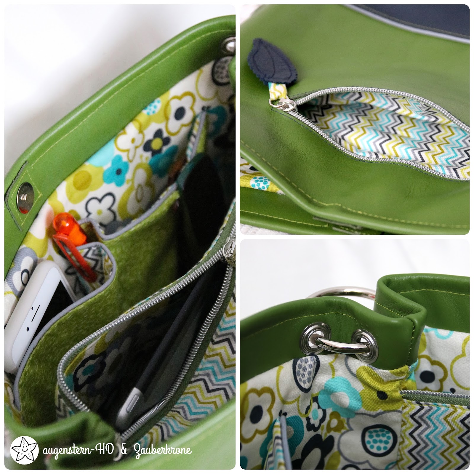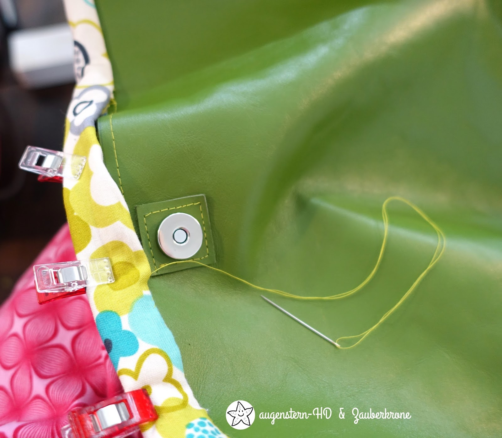 Das Innenfutter aus Baumwollstoffen mit diversen Fächern und die Leder-Außentasche mit den Magnetknöpfen habe ich ganz gut fertig stellen können. Nur zusammengenäht werden musste es noch am nächsten Tag.