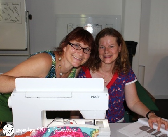 Auf dem Foto ist links Frau Machwerk zu sehen und neben ihr sitze ich an meiner Nähmaschine, eine einfache Pfaff Select 1523, auf ihr nähe ich meine Taschen.