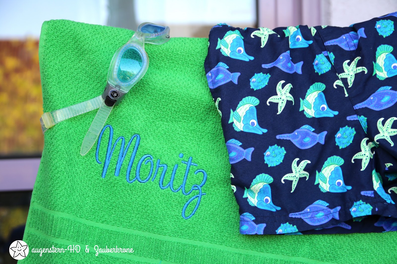 Noch gerade rechtzeitig habe ich gestern die beiden Schwimmbad Handtücher unserer Kinder mit der Stickmaschine personalisiert. So geht kein Handtuch mehr verloren. Das ist auch für den Schwimmunterricht in der Schule ganz praktisch.