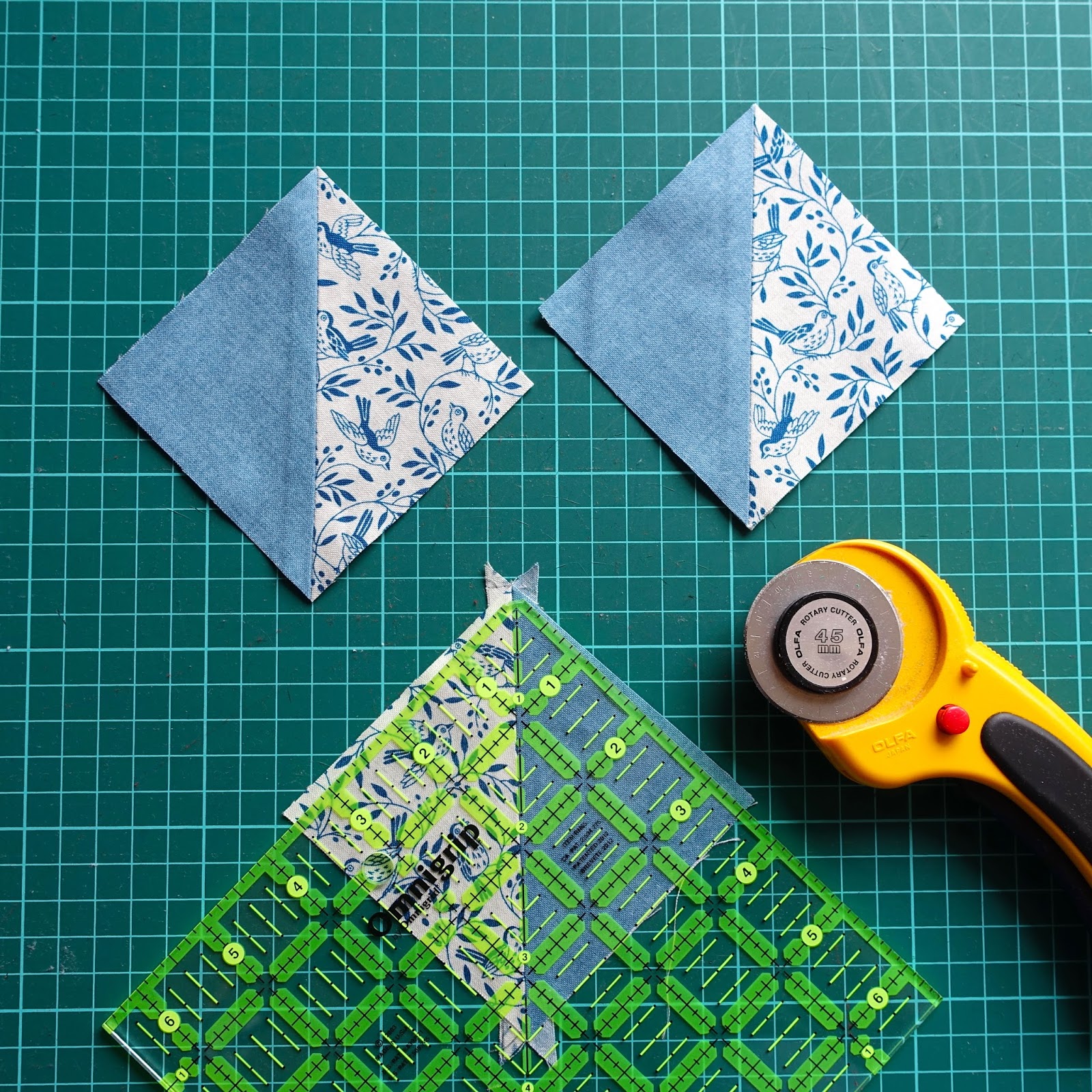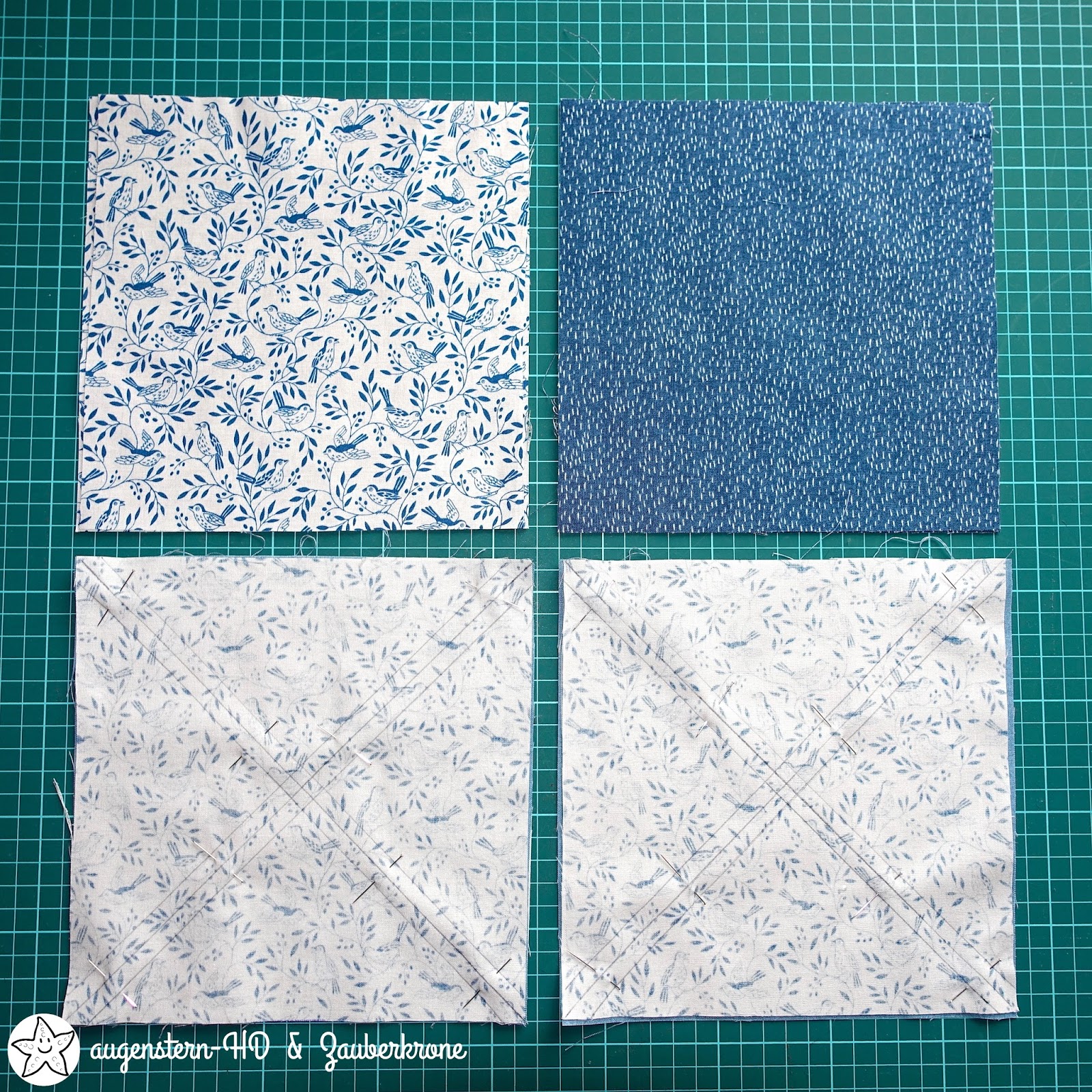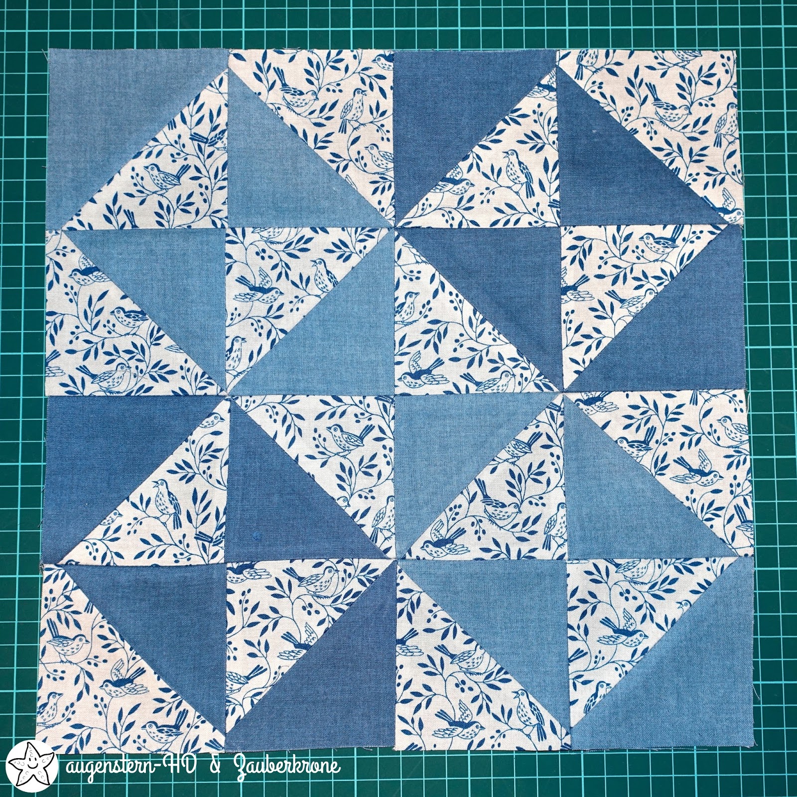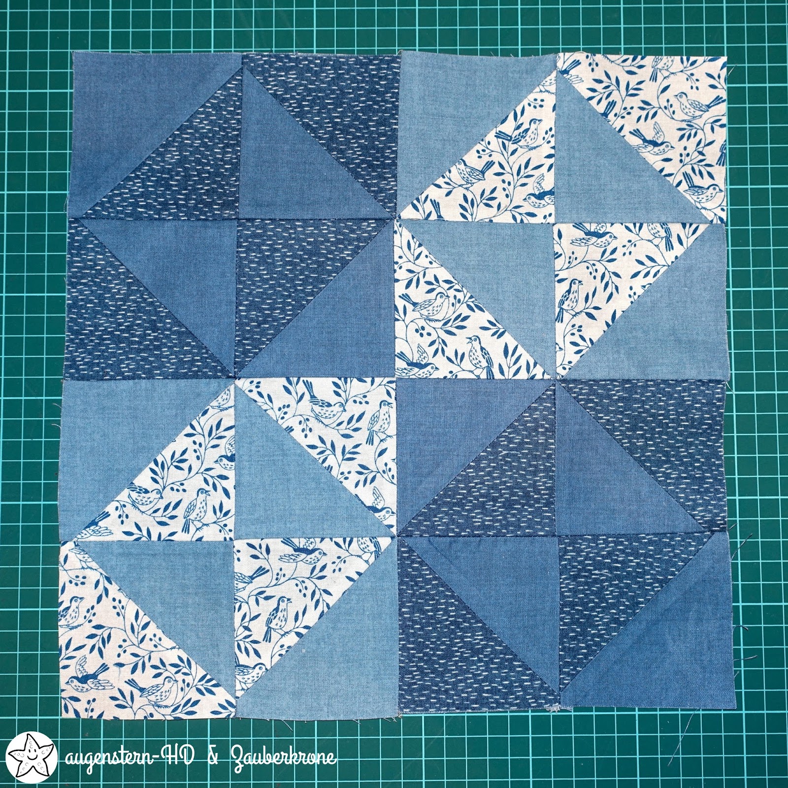 Für meine ‚Broken Dishes‘ hatte ich mir vier unterschiedliche Stoffe ausgesucht, aber DER mit dem Songbird Pattern musste unbedingt dabei sein. Er passt ausgezeichnet zum Monat März und ist farbstimmig mit den beiden Dash Pattern, in blau und marineblau. Er spiegelt meine Sehnsucht nach Frühling wieder. Ja, ich will endlich den Frühling zurück!