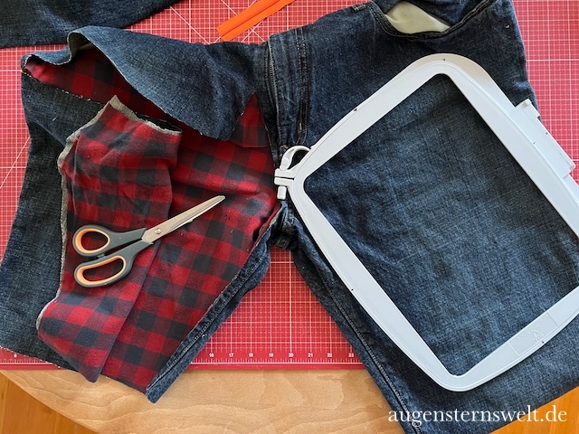 Also schnitt ich aus dem großen Hosenbein die passende Größe für meinen Stickrahmen zu. Ich arbeite mit dem großen Stickrahmen meiner Pfaff Creative 3.0 in der Größe 200 × 260.