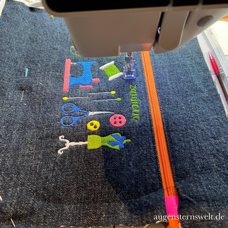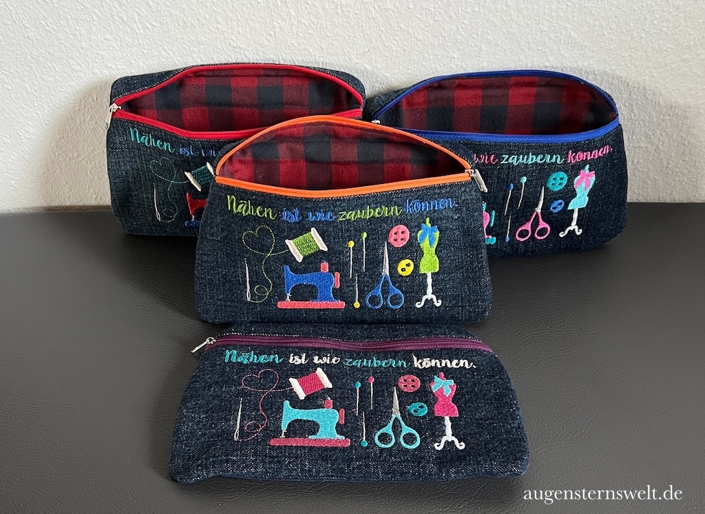 Der Reißverschluss wurde eingenäht, die unterschiedlichen Stickgarnfarben nacheinander gestickt und schließlich wurde das Täschchen direkt im Stickrahmen zusammengenäht. Klar, das Ganze dauerte deutlich länger etwa zwei Stunden pro Täschchen, mit allem Drum und Dran. Danach mussten noch die Sprungfäden abgeschnitten werden. Und am Ende hält man wunderschöne Täschchen in den Händen, die einfach glücklich machen.