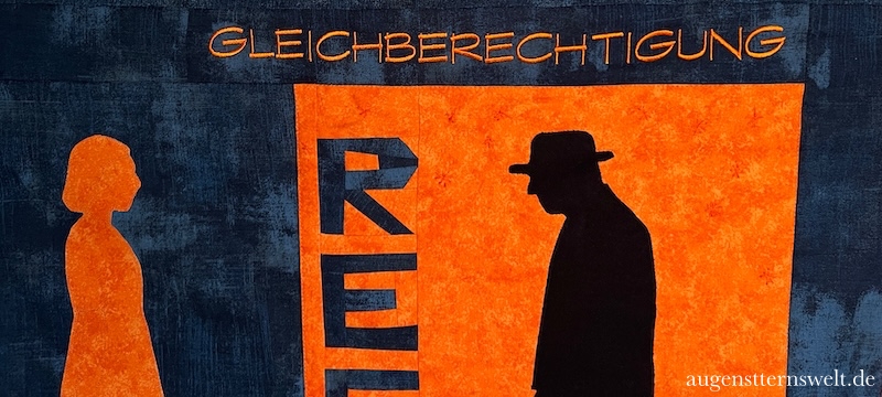 Die applizierten Silhouetten von Frau und Mann symbolisieren ein bestehendes Machtgefälle – und den Mut, sich ihm entgegenzustellen. Worte wie Respekt, Freiheit, Mut, Würde, Zivilcourage, Gleichberechtigung, Schutz und Frieden habe ich mit verschiedenen Techniken sichtbar gemacht: genäht mit Foundation Paper Piecing, gestickt mit der Maschine.