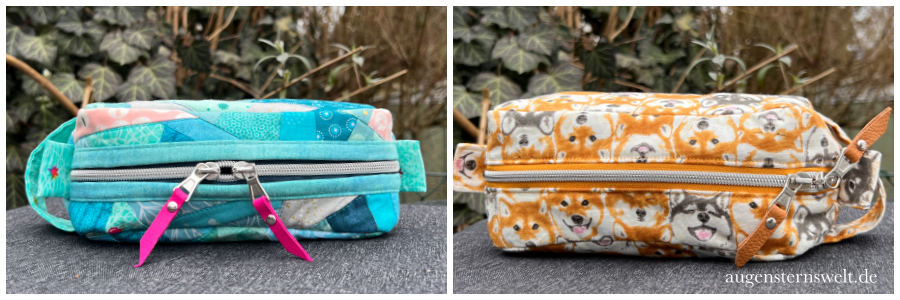 Auf dem Bild ist BERTA rechts, genäht aus Canvas mit Hunden/Shiba Inu und BERTINE links, hier in der Patchwork „quilt as you go Variante“.