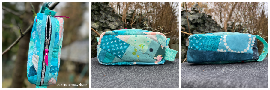 Spannend fand ich beim Probenähen auch der Vergleich der beiden Utensilo-Täschchen: Während BERTA klassisch genäht wird, kommt bei ihrer Schwester die Sandwichtechnik zum Einsatz, die Patchworker mögen. Dabei werden Außenstoff, Vlies und Innenstoff in einem Arbeitsgang miteinander versteppt, das sorgt für eine besonders hochwertige Optik.