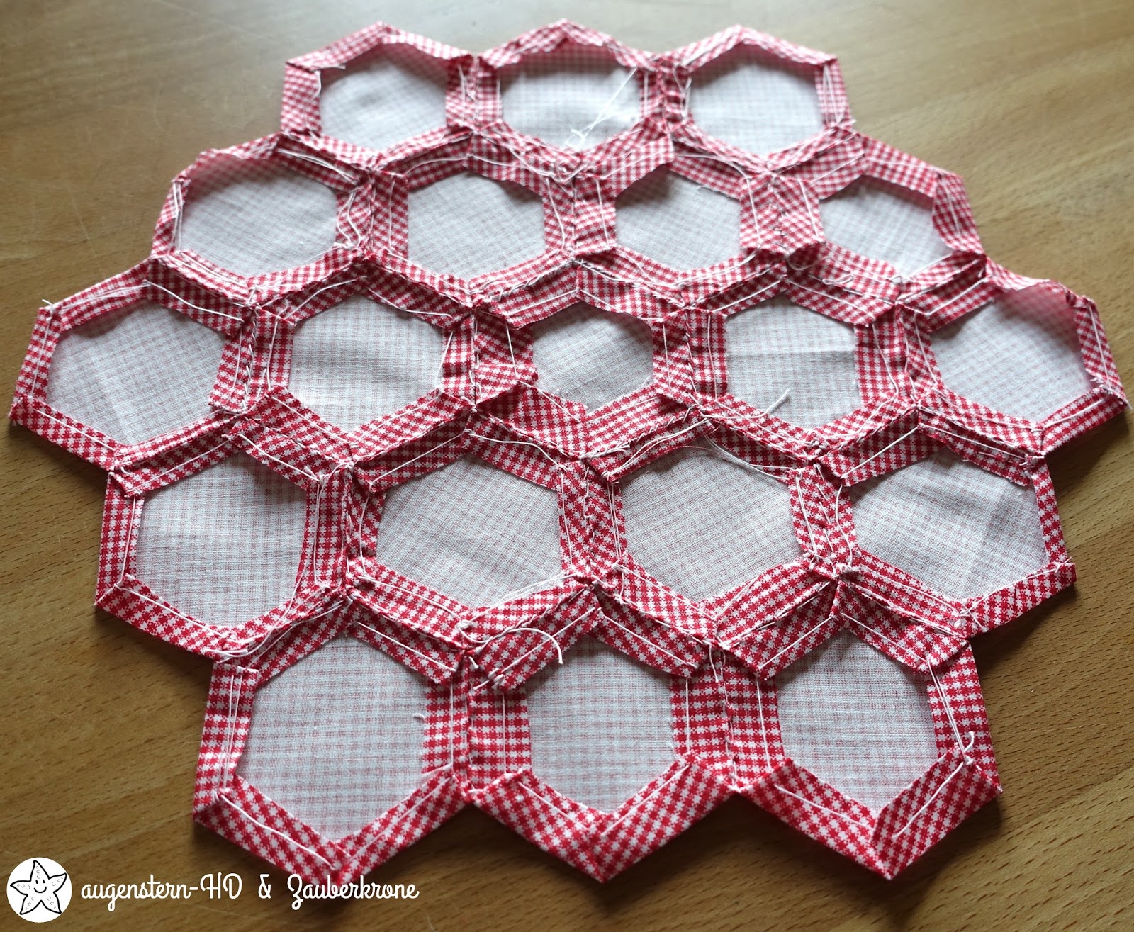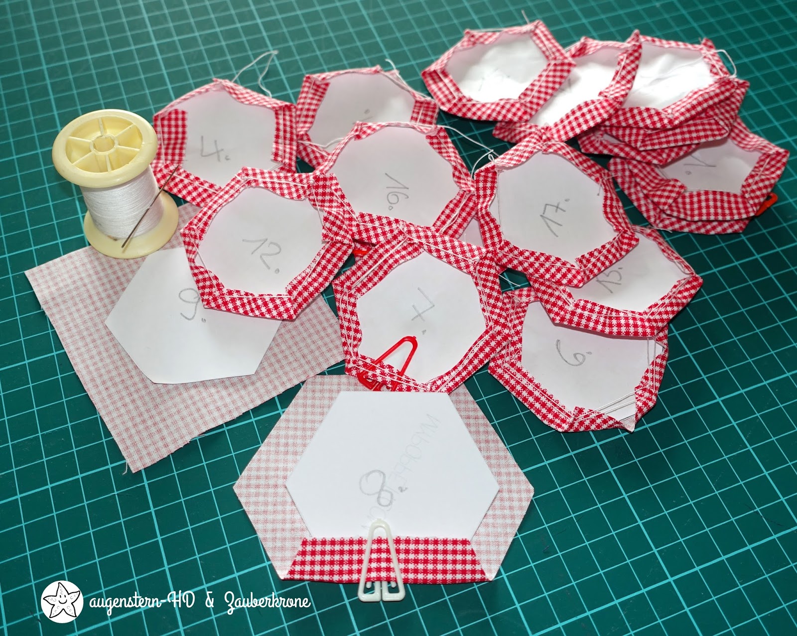 Mit Nadel und Faden habe ich per Handnähen 19 Hexies geduldig zusammengenäht.