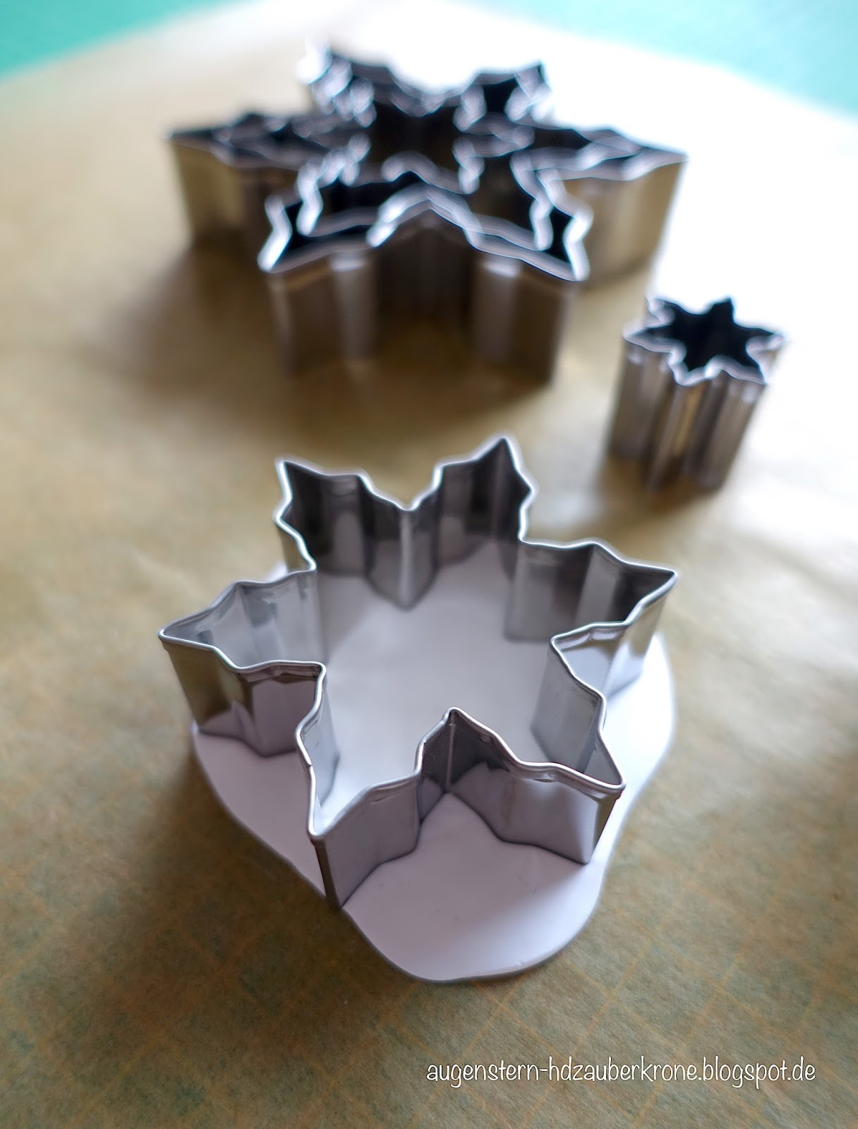 Beim Händler hatte ich in der Gebrauchsanweisung gelesen, dass die Modelliermasse auf keinen Fall in die Mikrowelle erhitzt werden darf. Also kochte ich Wasser (max. 60°C) und legte die Stückchen einzeln in den Bottich, zum Aufwärmen. Abgetrocknet wurden die Stücke mit weißem Küchenpapier, um anschließend mit den Händen zu einer Kugel gerollt zu werden. Ganz wichtig, für das Ausrollen ein Stück Backpapier auslegen. So löst sich die Masse superleicht von der Arbeitsplatte, ohne zu zerreißen. Außerdem ist es viel, viele leichter die Sterne aus den Backförmchen heraus zu holen. Das Ausrollen braucht ganz viel Kraft, aber das Ausstechen macht richtig Spaß!