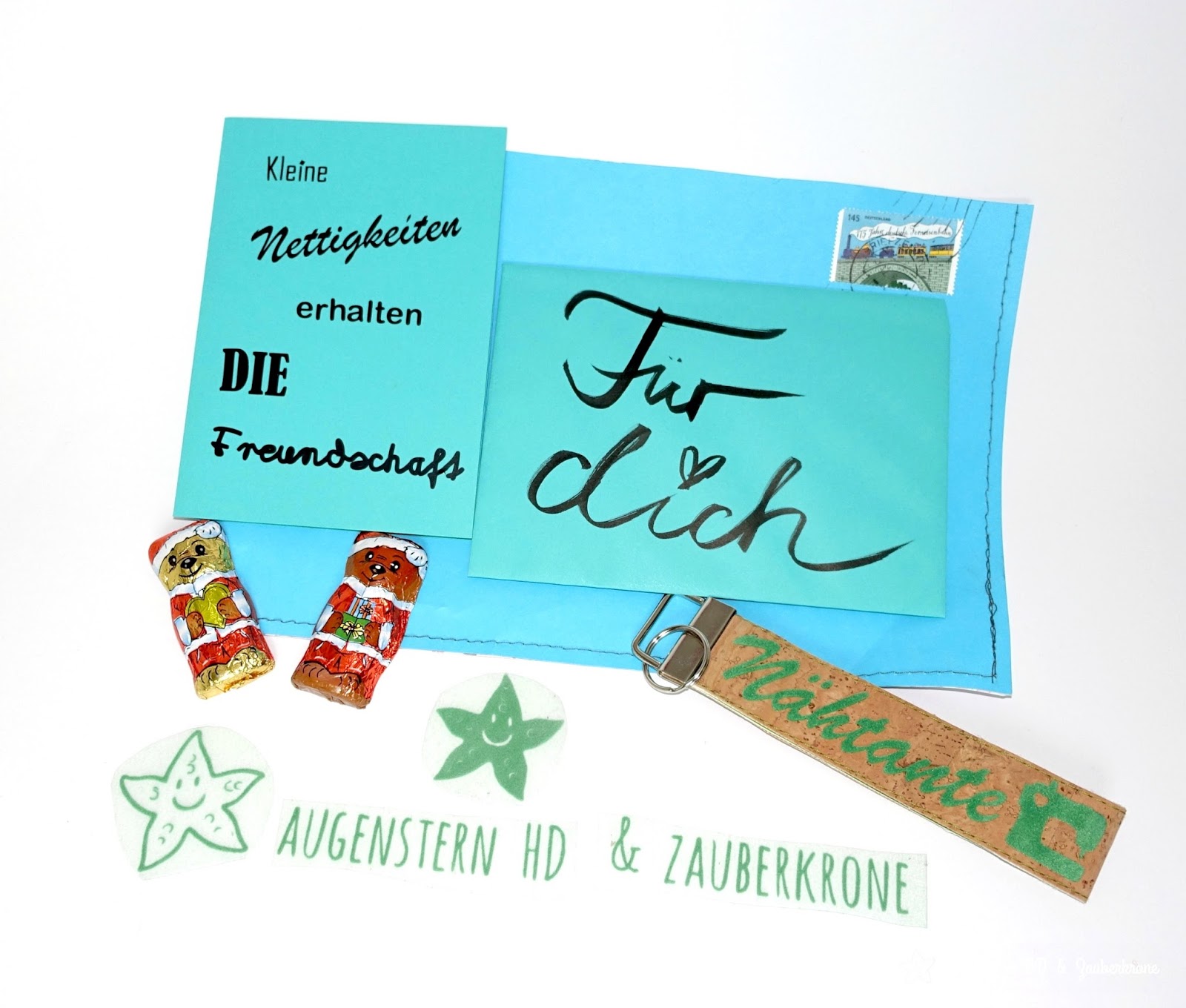 „Liebe ♥ Anna, es hat mich wirklich gefreut, als dein selbstgenähter Briefumschlag bei mir ankam. Mit dem Schlüsselband „Nähtante‘ hast du voll ins Schwarze getroffen! ;-D Und, der geplottete Schriftzug mit den Augensternen sind wunderschön geworden. Damit werde ich mir eine schöne Handtasche nähen! Ich zeige sie dir dann. Juhuuuu! Vielen, lieben Dank, die Überraschung ist dir gelungen! Du bist ein Schatz!!!!“ :-*