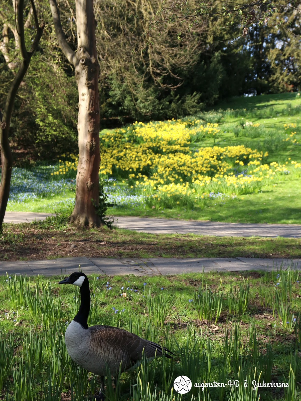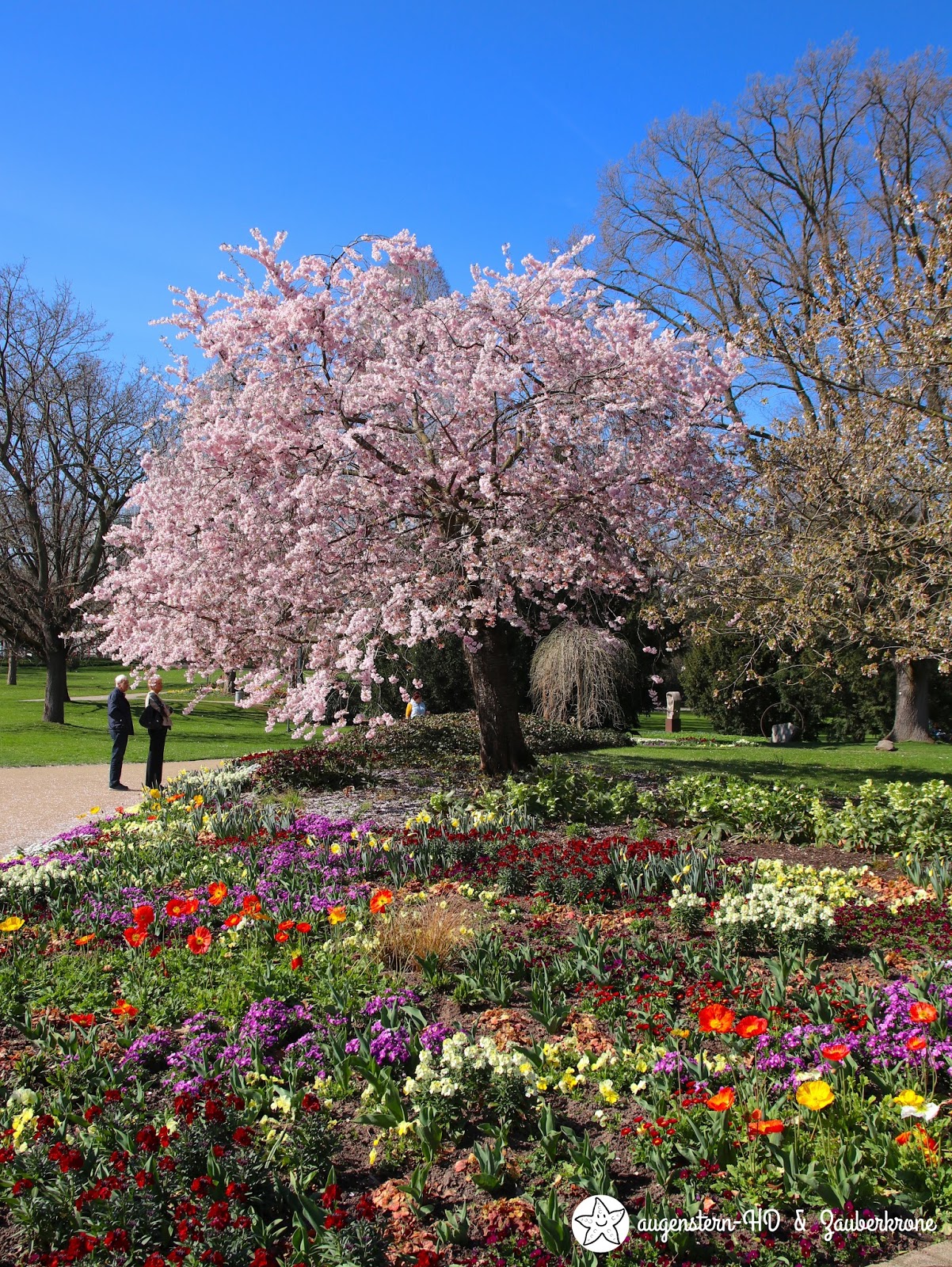 Weiter ging die Tour entlang der wunderschön bepflanzten Beete am Wegesrand. Hier waren riesige Flächen mit Stiefmütterchen, Primeln, Tulpen, Hyazinthen, Bellis, Mohnblumen und weiteren gut riechenden Frühlingsblumen zu sehen. Wie prachtvoll auch die Japanische Kirsche mit rosa Blüten den Frühling ein klingen lässt!