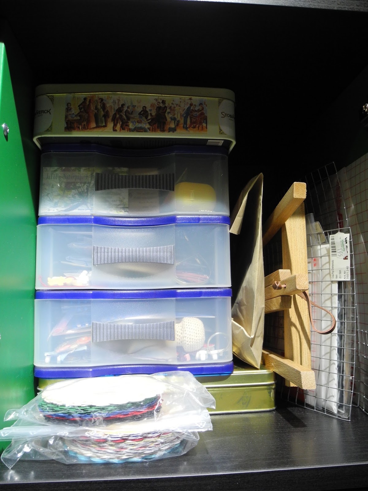 die stickmotive für fadengrafik kopiere ich aus der zeitschrift, vermerke auf dem motiv, aus welcher nummer und seite der zeitschtift das motiv stammt und laminiere sie ein. sie sind nicht nach themen geordnet, außer die weihnachtsmotive. also muss ich unter umständen die tüten schon durchsuchen, wenn ich etwas bestimmtes suche. aber sie sind ordentlich aufgeräumt, bis auf die motive, die ich sehr oft benutze. diese habe ich wiederum in einem schub geordnet und schnell griffbereit.*******************