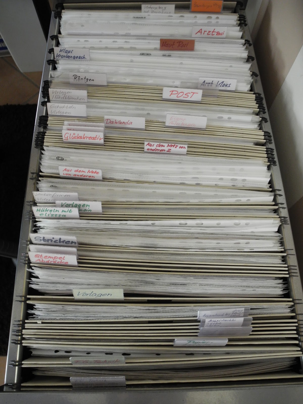 Aber dein Ordnungssystem ist klasse und hat richtig System. Hängeregister find ich übrigens genial. Im Büro hatte ich mir extra einen Schrank damit besorgen lassen. Ich kann's nur jedem empfehlen. Es ist viel besser als die ollen Stapel auf dem Schreibtisch oder im Rollcontainer.