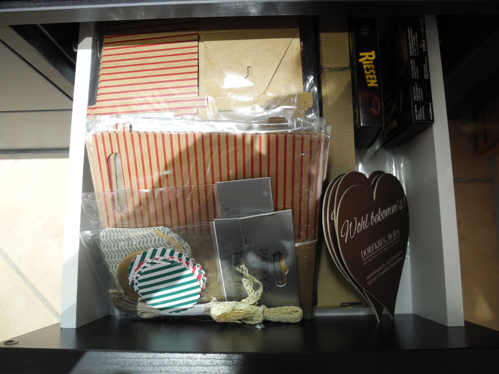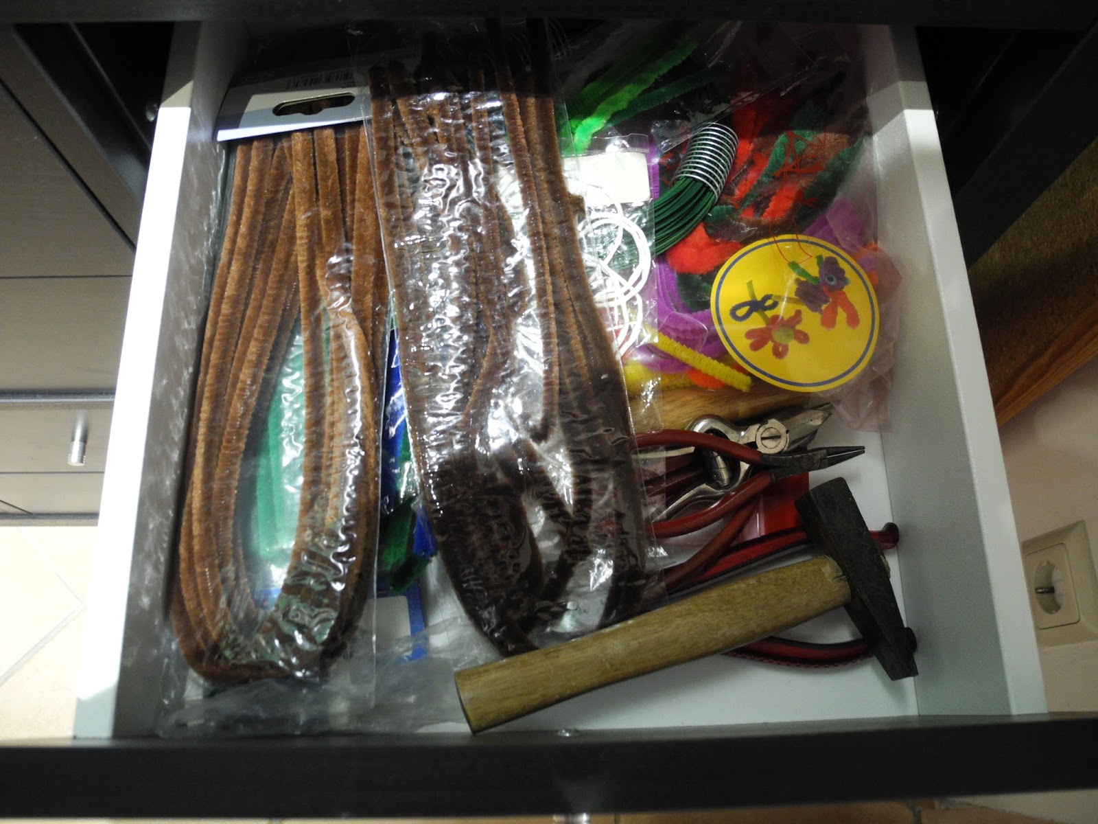 klebebandroller, scheren ect. gehören nicht in kinderhände. das rechte fach oben beherbergt aufbewahrunskistchen mit kleinteilen, lampendraht,