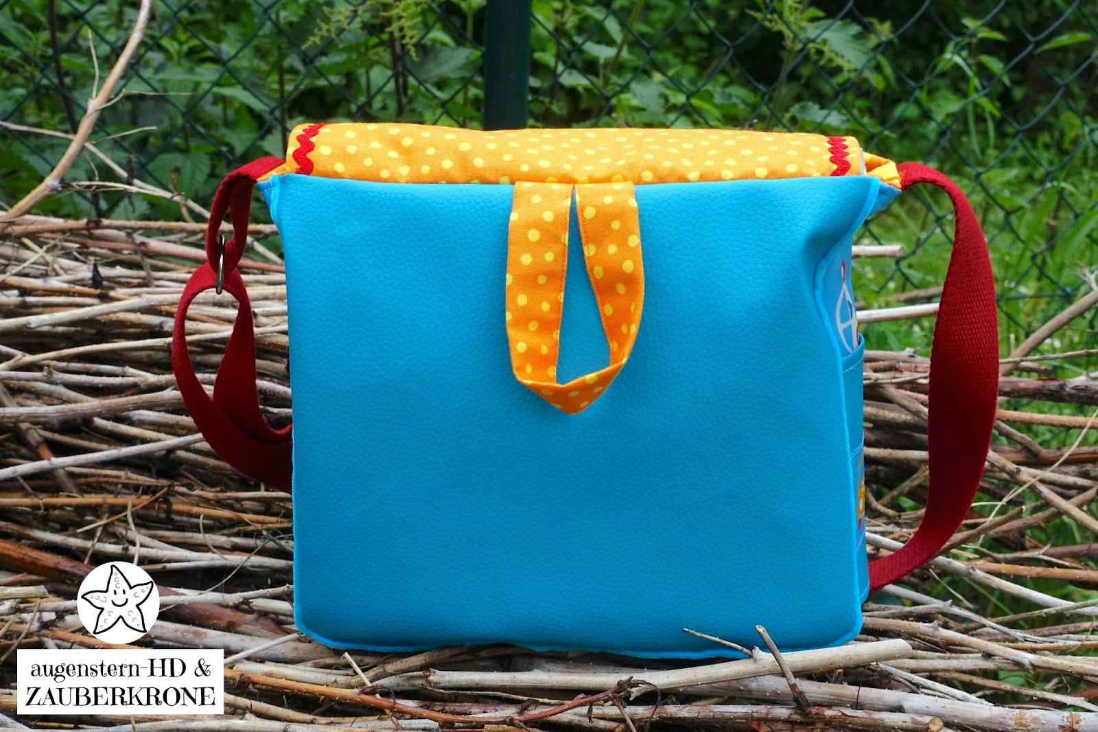 Das herrliche E-Book ist sehr detailliert geschrieben und selbst Nähanfänger kommen gut damit zurecht. Viele Details sind enthalten und hier bei meinem Käferlein zeige ich nur ein paar wenige Besonderheiten wie z.B. zwei kleine Seitentaschen für Kleinigkeiten oder Stifte, die schon erwähnte zweigeteilte Klappe, ein Schlüsselband, an der Fronttasche das eingenähte Paspel Band, den Mama-Tragegriff und ein extra Fach für ein Freundebuch, einen Malblock oder das Lieblingsbilderbuch!