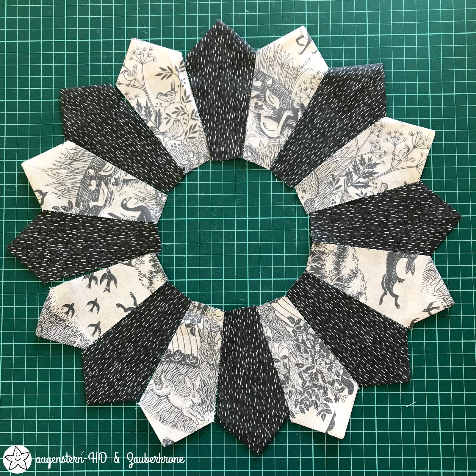 Da fehlte einfach die Harmonie bei der Umsetzung und somit wurde auch das Farbspiel der Dresdner Plate final noch verändert. Gut, dass von dem schwarzen und dem graubunten Stoff genug vorrätig war, so konnte ich fix die entsprechenden Blütenblätter austauschen. Den Mittelkreis habe ich etwas vergrößert, weil das Loch doch sehr begrenzt und knapp abgedeckt war. Sicher ist sicher!!