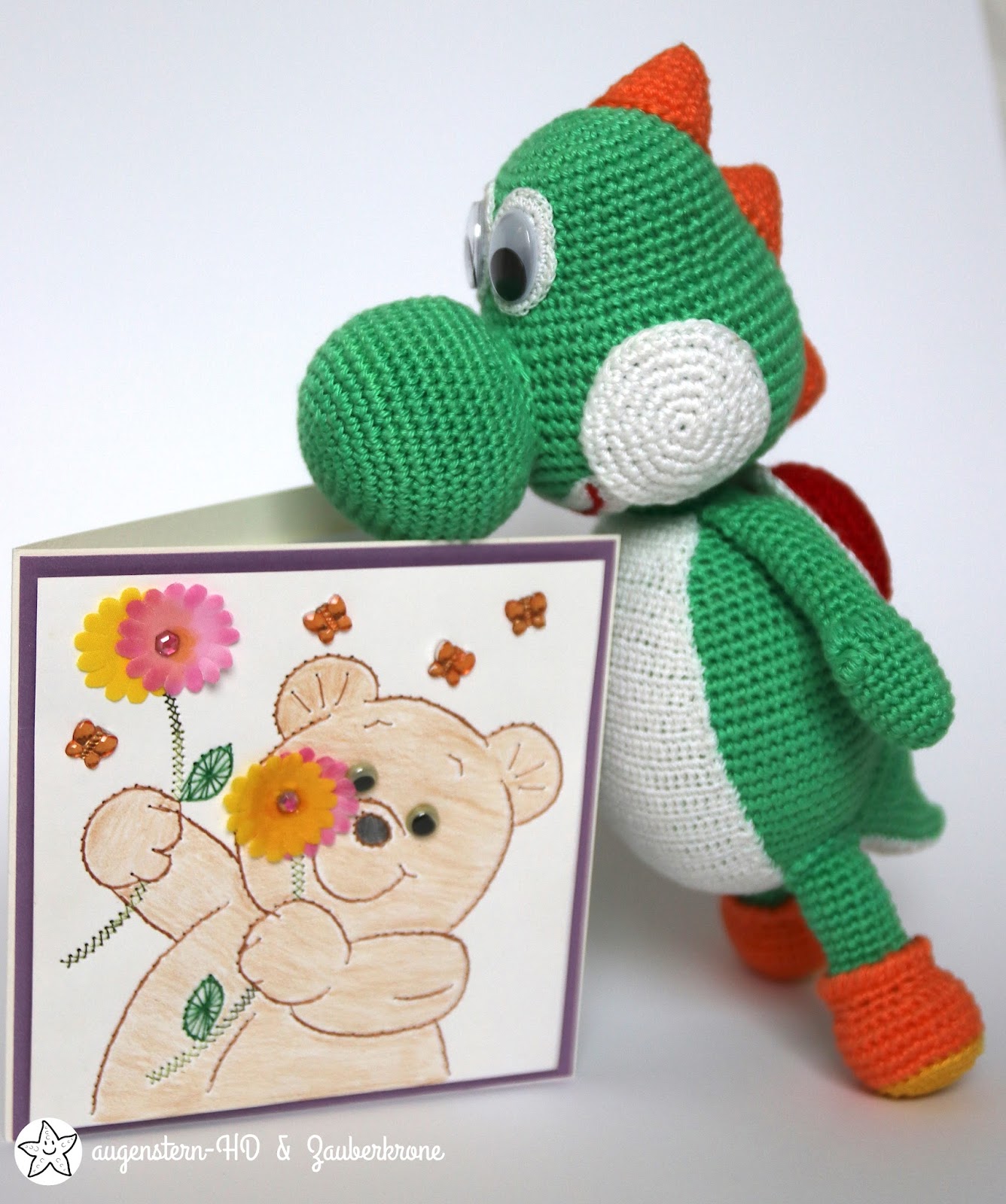der Yoshi ist wirklich genial geworden- das kann ich beurteilen, bin mit meinen kindern früher durch sämtliche mario Abenteuer geschliddert :0) aber deine Missi steht dem in nichts nach, da hat sich Rosis Tochter bestimmt auch königlich drüber gefreut! Und die tolle Karte mit den Regenbogenlinsen hätte mir auch gefallen… da freu ich mich, am montag mehr über Rosi zu erfahren…hab ein schönes Wochenende und ganz LG aus Dänemark, Ulrike :0)