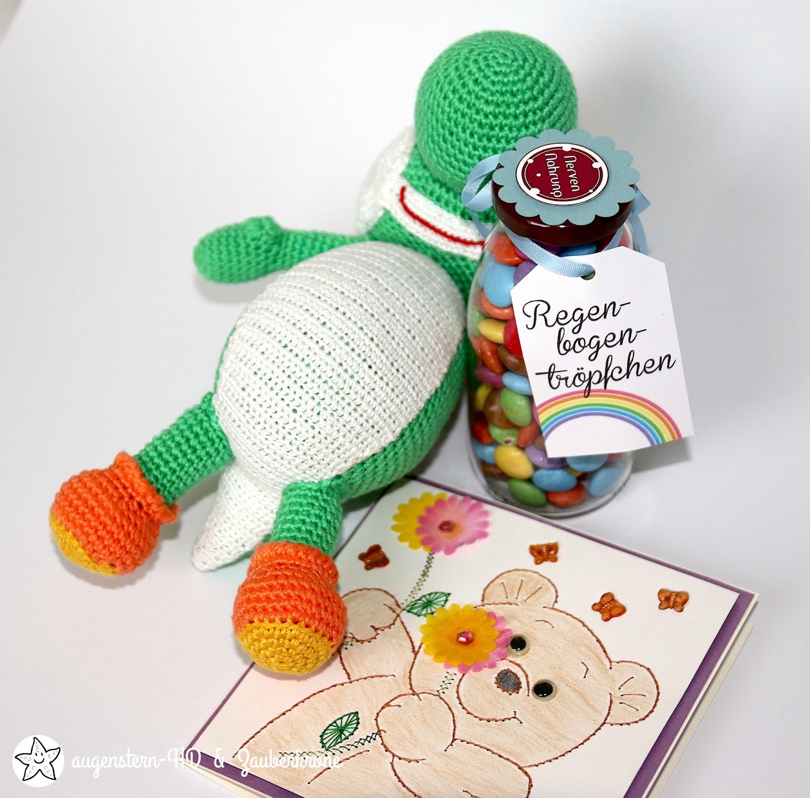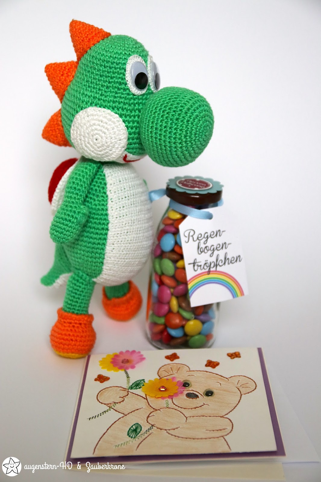 Der Yoshi, die Karte und auch das Regenbogentröpfchen Glas sind wunderschön!