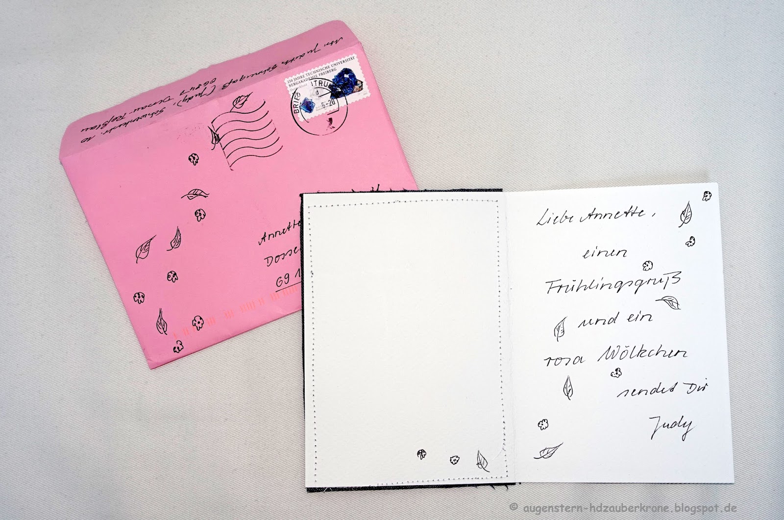 Ein rosa Briefumschlag, schön bemalt mit fliegenden Blättern. So nett anzusehen. Schöne Idee ♥.